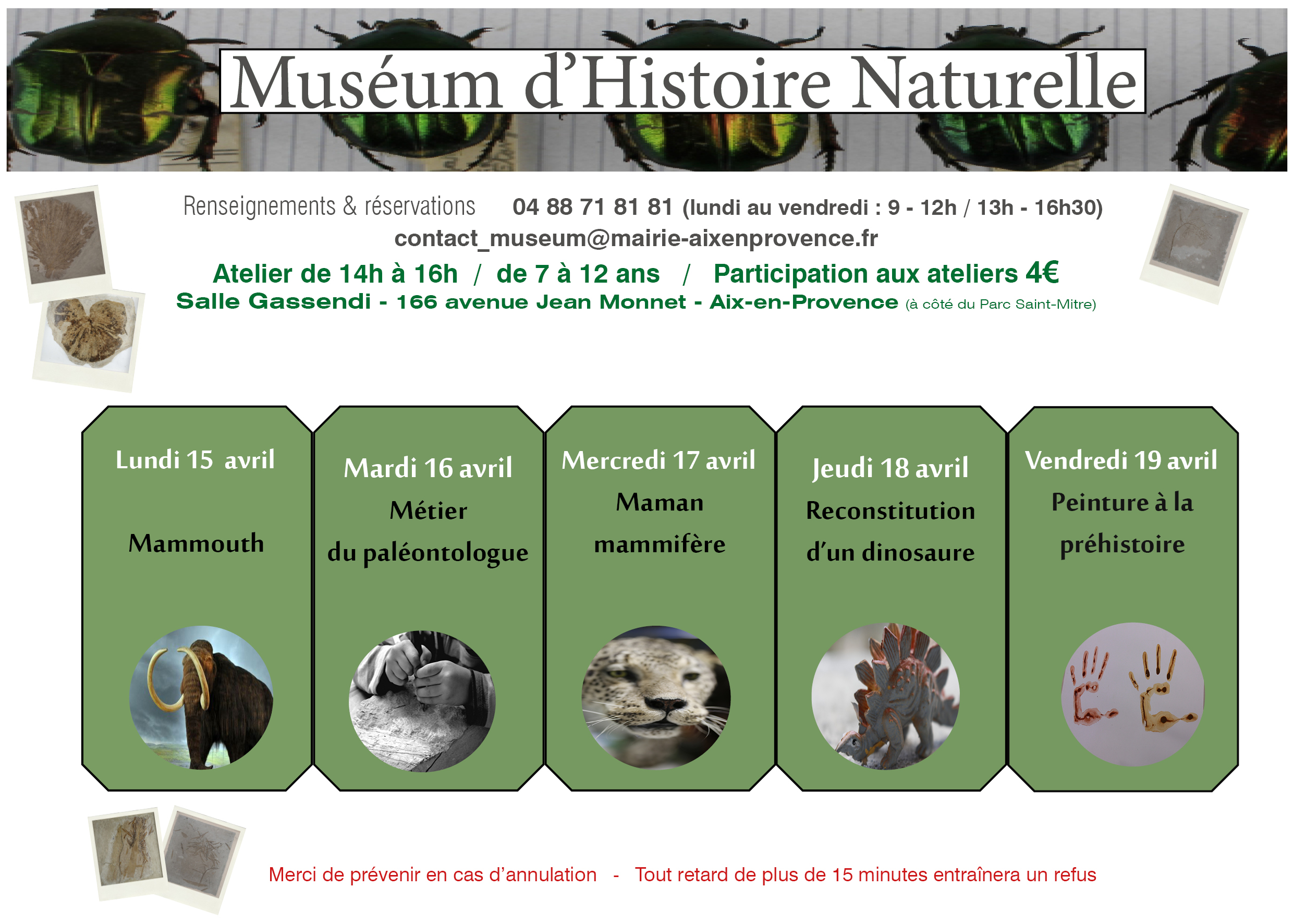 Le Muséum d'Histoire Naturelle d'Aix-en-Provence vous propose des ateliers pour les enfants de 7 (CP ou CE1 en fonction des ateliers) à 12 ans.