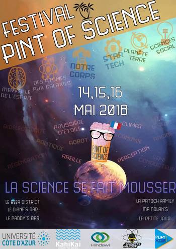La festival international de vulgarisation scientifique Pint of Science arrive à Nice les 14, 15 et 16 Mai prochains avec 12 soirées couvrant différents aspects des Sciences avec 5 thématiques Des atomes aux galaxies, Notre corps, Merveilles de l'esprit, Planète Terre, Des hommes aux Civilisation. 34 chercheurs locaux vont se lancer dans ce défi de vulgariser leur recherche devant un public non-expert de leur domaine dans un cadre différent de celui dans lequel on a l'habitude de voir et parler de sciences: des pubs et quelques bières. Le festival est née en 2012 dans l'esprit de 2 chercheurs londoniens voulant amener la science hors des laboratoires. En 2018, le festival sera présent sur 4 continents , dans 21 pays (https://pintofscience.com) et 34 villes françaises (https://pintofscience.fr).