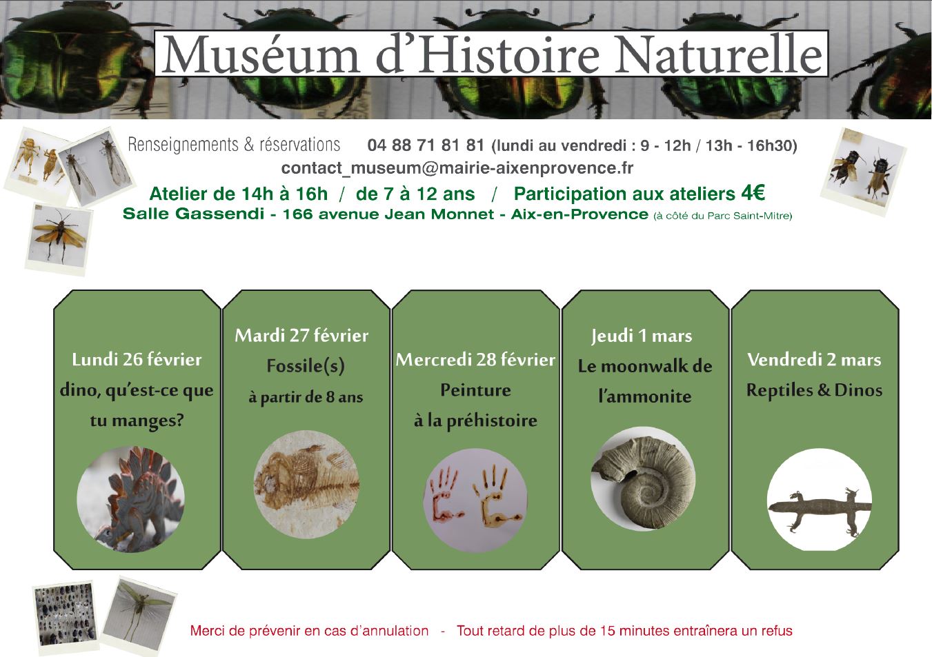 Le Muséum d'Histoire Naturelle d'Aix-en-Provence vous propose des ateliers pour les enfants de 7 (CP ou CE1 en fonction des ateliers) à 12 ans.