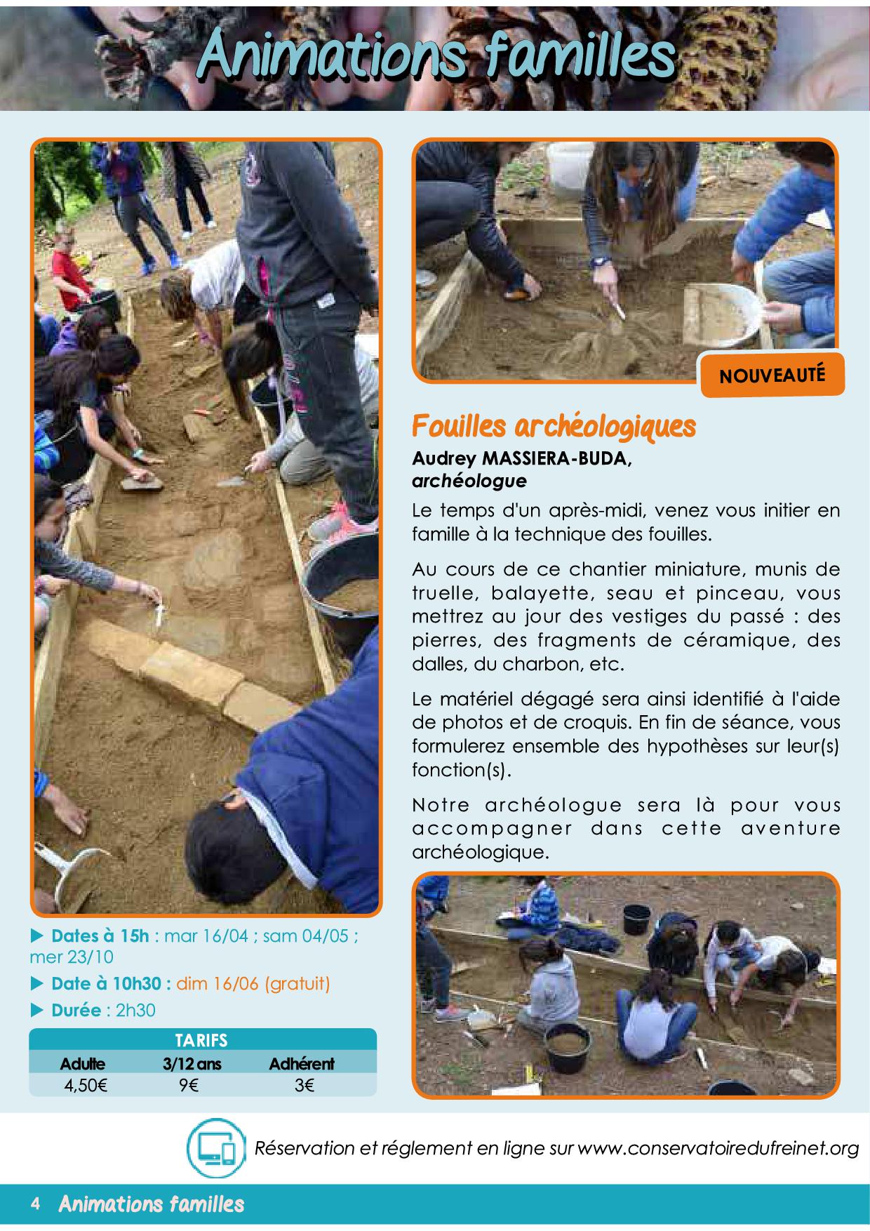 Ateliers archéo en famille par l'intermédiaire du Conservatoire du Freinet le mardi 16 avril, le samedi 4 mai, le dimanche 16 juin (gratuit à l'occasion des Journées Nationales de l'Archéologie) et le mercredi 23 octobre.