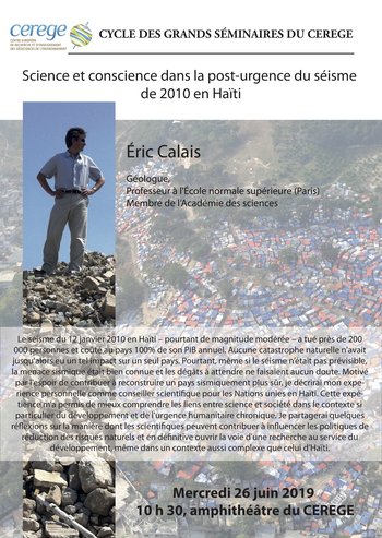 Le CEREGE invite Eric Calais, géologue, professeur au Laboratoire de Géologie de l’Ecole normale supérieure (Paris) et membre de l’Académie des sciences, a participer à un grand séminaire sur la question du séisme du 12 janvier 2010 en Haïti.
