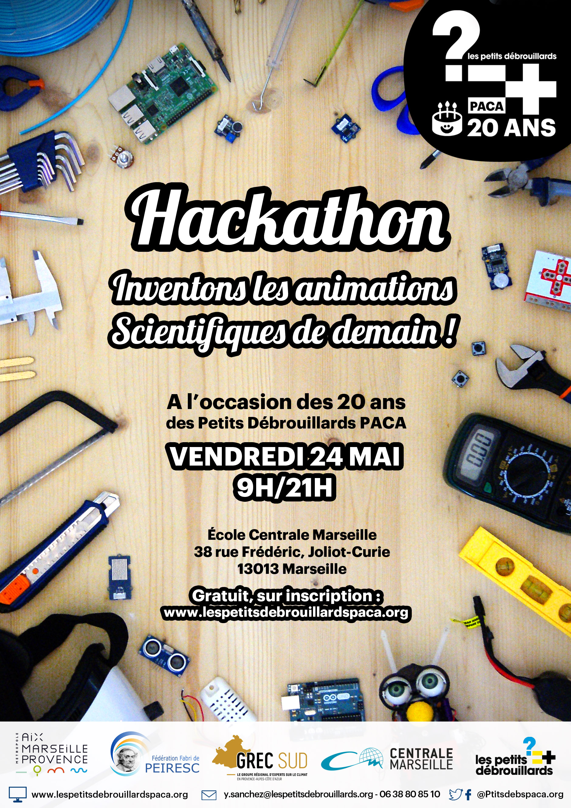 Curieux et curieuses, bidouilleurs, chercheurs, designers, animateurs, adhérents, étudiants, ingénieurs... A l’occasion des 20 ans de l’association des Petits Débrouillards PACA, réunissons-nous en équipe pendant 12h montre en main pour imaginer et fabriquer des dispositifs d’animation et de médiation scientifique ludique (expériences, maquettes, jeux de rôle, serious game, installations artistiques, numérique...). Nous auront à disposition un atelier, des outils, un fablab et un buffet pour arriver à notre objectif et présenter nos projets devant les participants, un jury et le documenter sur internet pour le partager au plus grand nombre !