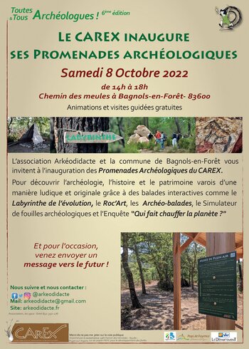 L'association Arkéodidacte et la commune de Bagnols-en-Forêt vous invitent à l'inauguration des Promenades Archéologiques du CAREX. Pour découvrir l'archéologie, l'histoire et le patrimoine varois d'une manière ludique et originale grâce à des balades interactives comme le Labyrinthe de l'évolution, le Roc'Art, les Archéo-balades, le Simulateur de fouilles archéologiques et l'Enquête "Qui fait chauffer la planète?". Et pour l'occasion,