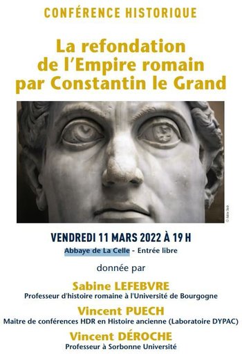 Cette conférence est donnée à l’issue de la journée d’étude consacrée à Constantin le Grand, qui se déroule les 10 et 11 mars. Ouverte au public, elle sera également retransmise sur le site internet (var.fr) et la page Facebook du Département du Var. Les trois historiens, Sabine Lefebvre, Vincent Puech et Vincent Déroche, tous trois spécialistes du IVe siècle, aborderont la refondation de l’Empire romain par Constantin le Grand avec une évocation du règne de Constantin puis un focus sur la fondation de Constantinople. Un point historiographique sera également fait sur les sources historiques qui permettent d'écrire l'histoire de ce règne.