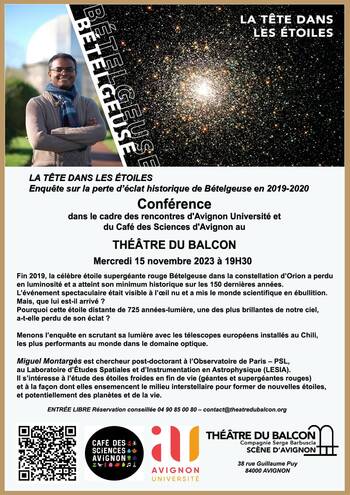 Le 15 novembre au Théâtre du Balcon à Avignon, un des plus grands spécialistes de l'étoile Betelgeuse dans la constellation d'Orion, le Dr Miguel Montargès viendra nous parler cette fascinante supergéante rouge, une des étoiles les plus grandes que nous connaissions !