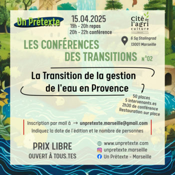 Rejoignez-nous 📅 le mardi 15 avril, à 📍 la Cité de l’Agriculture (6 sq Stalingrad, 13001, Marseille), pour une conférence citoyenne sur la Transition de la gestion de l’eau en Provence !