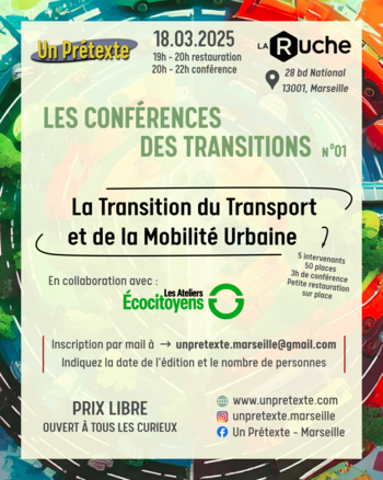 Première conférence le mardi 18 mars, à la Ruche (28 bd National, 13001, Marseille), sur la thématique de la Transition des Transports et de la Mobilité Urbaine !