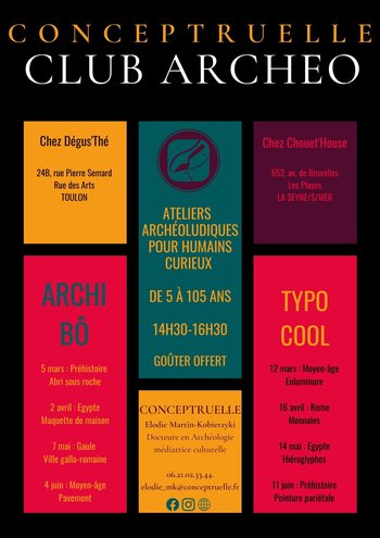 Retrouvez-moi chez Chouet'House pour 4 ateliers exceptionnels dans un cadre accueillant , funky et gourmand, pour un Club Archéo réservé aux plus malins et aux plus curieux des fans d'histoire et d'archéologie!