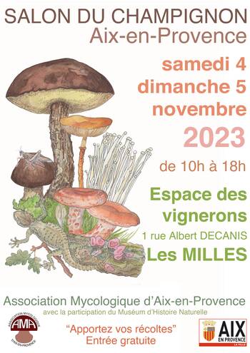 L'Association mycologique d'Aix-en-Provence (AMA) fête cette année ses 45 ans, et vous invite comme chaque année au SALON du CHAMPIGNON pour l’exposition annuelle d’espèces fraîches afin d’en découvrir leur diversité le samedi 4 et dimanche 5 novembre 2023 de 10h à 18h.