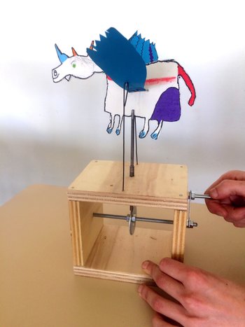Construction d’un être ailé en carton et en bois dont les ailes mécanisées battent grâce à une manivelle.