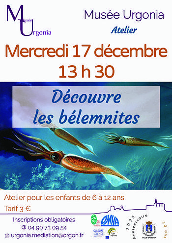 - Atelier « A la recherche des Bélemnites (6-12 ans – 3 euros) : Après une explication de ce que sont les fossiles, les enfants découvrent les bélemnites : leurs liens avec les autres céphalopodes, leur anatomie, leur temps d’existence, leur mode de vie. Les enfants s’amusent ensuite à trier des sédiments dissimulant des rostres de bélemnites. Chaque enfant pourra repartir avec un morceau de rostre de bélemnite.
