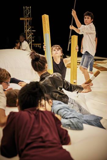 Formés en ateliers depuis le mois de février par le compositeur Benjamin Dupé et la chorégraphe Balkis Moutashar, les enfants du Pays d’Apt Luberon participant au projet sont autant son corps de ballet que l’orchestre interprète de sa partition. Au fil de cette marelle musicale dans laquelle chaque mouvement est prétexte à la production sonore, l’espace est envisagé comme une « lutherie en construction », modulée, habitée par des enfants énergiques et joueurs, à l’écoute d’eux-mêmes, des autres et des sons produits.
