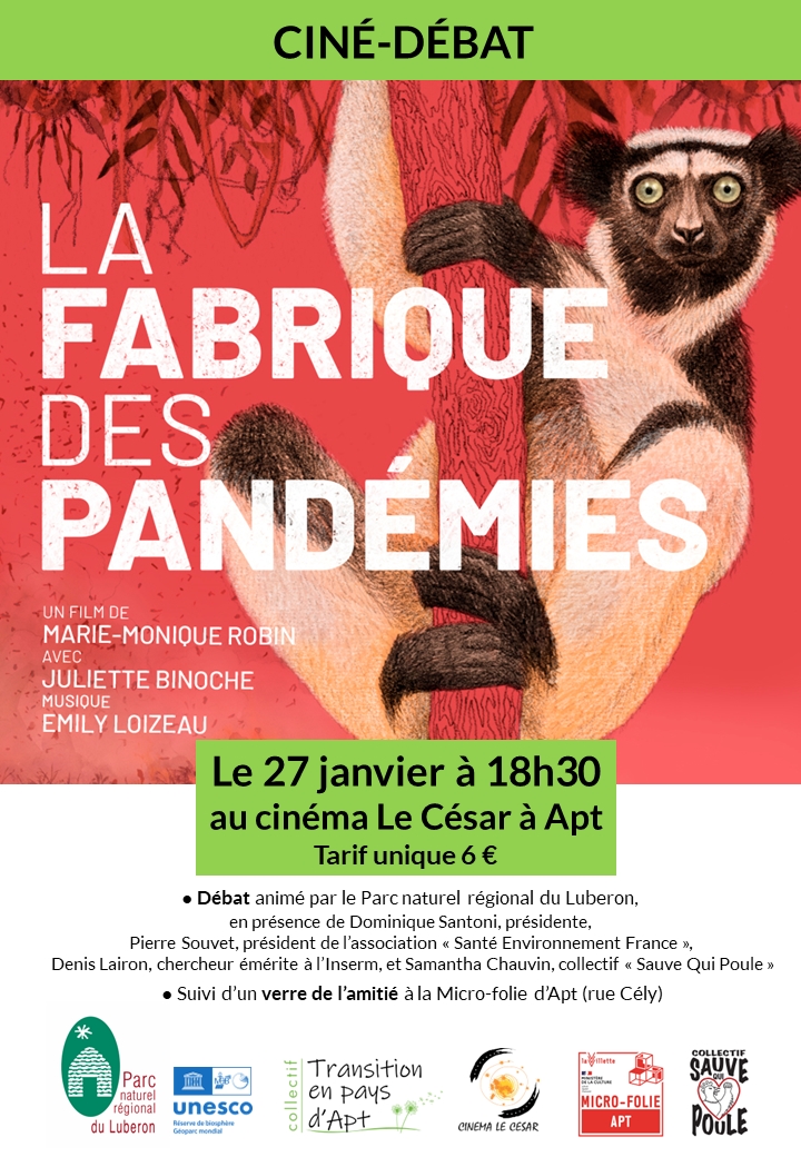 Le Parc naturel régional du Luberon et le collectif Transition en pays d’Apt proposent une projection-débat vendredi 27 janvier à 18h30 au cinéma Le César à Apt, avec le film « La Fabrique des pandémies » de Marie-Monique Robin, en partenariat avec la mairie d’Apt et en présence de Dominique Santoni, Présidente du Parc. Le film sera suivi à 20h30 d’un débat avec le docteur Pierre Souvet, président de l’association « Santé Environnement France », Denis Lairon, chercheur émérite à l’Inserm spécialisé en alimentation méditerranéenne, et Samantha Chauvin, éleveuse de volailles et administratrice du collectif « Sauve Qui Poule ». La discussion se poursuivra ensuite à la Micro-Folie d’Apt (rue Cély), autour d’un verre de l’amitié offert par le Parc et le collectif Transition en pays d’Apt. Tarif unique : 6€. |