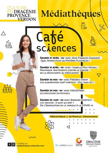 Dans un esprit convivial, la science s'invite autour d'un café à la médiathèque Jacqueline de Romilly de Draguignan. Des chercheurs viendront y présenter et échanger avec vous sur des questions scientifiques diverses, en toute simplicité. En partenariat avec Gulliver et Science pour tous 06.