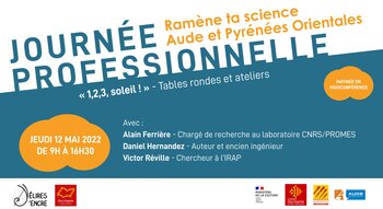 Dans le cadre du projet Sciences en médiathèque, Délires d'encre, Occitanie Livre & Lecture, et les médiathèques départementales de l'Aude et des Pyrénées Orientales organisent une journée professionnelle sur la médiation scientifique le 12 mai 2022, dont la matinée est à suivre en visioconférence. A destination des médiathécaires, cette journée a pour thématique "Le soleil", et se déroulera en simultané sur deux lieux : à la médiathèque de Cabestany et sur le site de Thémis Solaire Innovation à Targasonne.