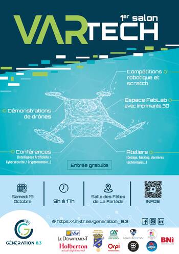Samedi 19 octobre, le SALON VAR TECH, vous attends avec une douzaine de stands (moitié des professionnels et moitiés des associations culturelles et scientifiques locales), des animations (robots, drones, impression 3D...), un concours de Scratch pour les plus jeunes et des conférences, pour tous, toutes les 1/2 heures. ;-)