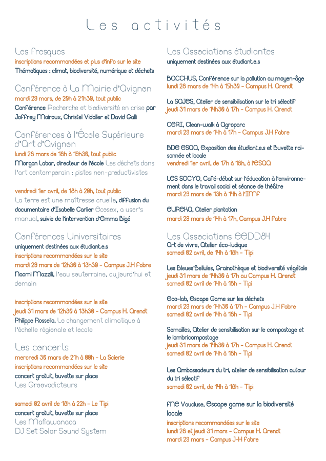 Tout le monde pourra y trouver son bonheur, entre atelier d'intelligence collective avec diverses fresques mises en avant, après-midi convivial (au Tipi, entre après-midi stands d'animation et marché de producteurs), conférences sur des thématiques diverses (comme sur la biodiversité locale ou sur les déchets en art contemporain entre autre) ainsi que des moments festifs avec des concerts (à la Scierie et au Tipi) au programme !