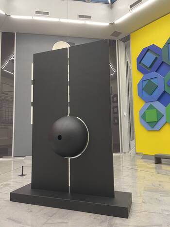 Pour son projet à la Fondation Vasarely, Damien Bénéteau reprend la forme du pendule, pensée à l’échelle d’un bâtiment, à l’image de celui de Foucault au Panthéon. Fixées au faîtage, à 11 mètres de hauteur, l’installation repose sur le même principe que les Variations : une sphère en mouvement traverse une imposante plaque de métal posée à la verticale, découpée dans toute sa hauteur et éclairée depuis sa tranche intérieure.