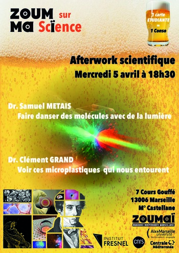 Deux chercheurs de l'Institut Fresnel expliqueront leur travaux et des notions scientifiques au public. Le Dr. Samuel METAIS effectuera une introduction des concepts optiques avec une intervention intitulée "Faire danser des molécules avec de la lumière" et le Dr. Clément GRAND nous parlera de sa thèse qui portait sur un sujet d'actualité "Voir ces microplastiques qui nous entourent".