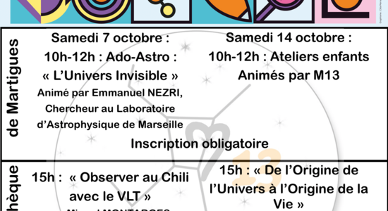 Le club d'astronomie M13 organise du 7 au 14 octobre à Martigues, la Fête de la Science. 2 conférences grand public présentées par des astronomes...
