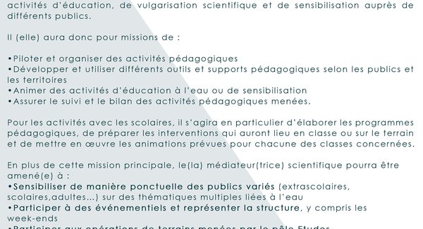 La Maison régionale de l'eau recrute ! Au sein d’une équipe de médiateurs scientifique et sous la responsabilité de la Responsable du Pôle...